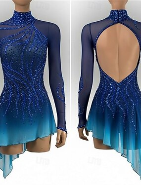 Robe de Patinage Artistique Femme Fille Patinage Robes Bleu + Bleu ciel Patchwork Dos ouvert Maille Spandex Elastique Entraînement Professionnel Compétition Tenue de Patinage Cristal / Stras manche