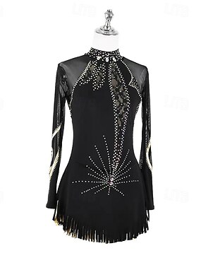Robe de patinage artistique Femmes Patinage Robe Noir Patchwork Trou de pouce Élastique Haute Élasticité Entraînement Compétition Tenue de Patinage Classique cristal pailleté manche longue Patinage