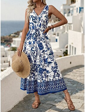 Femmes Robe maxi Robe d'Été Robe trapèze Robe Nuisette Robe Plissée Vacances Occasionnel Boho Plage Sortir Coupe régulière Fleuri Graphique Sans manches Col en U Bleu Été Printemps