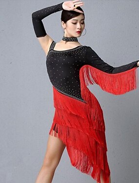 Robe de danse latine noire et rouge à franges pour femme, manches longues, ornée de strass, idéale pour les compétitions de bal de salon.