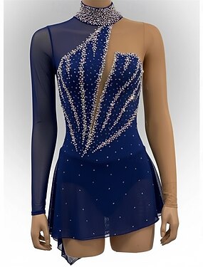 Robe de patinage artistique Femmes Patinage Robe Bleu marine Patchwork Ourlet asymétrique Élastique Entraînement Compétition Tenue de Patinage Classique cristal pailleté Sans manches Patinage sur