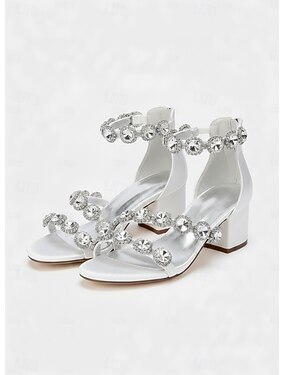 Escarpins blancs en satin à bride cheville et talons carrés ornés de strass - élégants escarpins de soirée à bout pointu pour les fêtes, les mariages et les événements formels