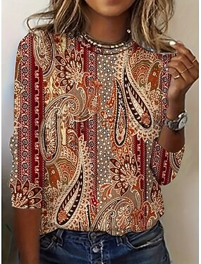 Femmes T-shirt Imprimé Fleuri Graphique Paisley ancien Mode Élégant manche longue Col ras du cou Col rond Hauts Réguliers Quotidien Week-end Bleu Bleu Poudré Violet Orange Marron Printemps Automne