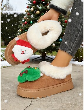 Bottes de neige de Noël camel pour femmes avec motif Père Noël et sapin de Noël - doublure en fourrure pelucheuse, bottines confortables et décontractées doublées de polaire pour la saison des fêtes,