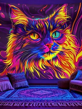 Tapisserie murale fluorescente à motif de chat psychédélique, idéale pour une décoration psychédélique, une tenture murale néon pour une chambre d'étudiant ou un salon.