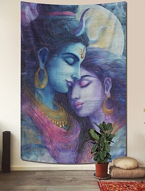 Tapisserie murale spirituelle bleue et violette représentant le couple divin Shiva et Parvati, avec la lune, idéale pour la méditation, la yoga, la chambre ou le salon. Décoration intérieure.