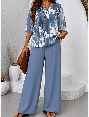 Femmes Ensembles de Pantalons Demi Manches Papillon Col rond Fleuri Graphique Élégant Vacances Occasionnel Quotidien Plage Bleu Orange Printemps & Été Coupe régulière