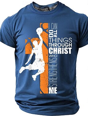 T-shirt graphique chrétien Bible pour hommes silhouette de basket-ball croix orange 'Je peux tout faire par Christ qui me fortifie' religieux décontracté à manches courtes gym église vêtements