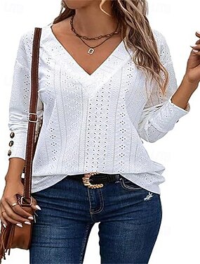Femmes Chemisier texturé Haut à œillets T-shirt à pointelle T-shirt Dentelle Patchwork Œillet Couleur Unie Élégant Mode Classique manche longue Col en V Hauts Réguliers Occasionnel Quotidien Plage