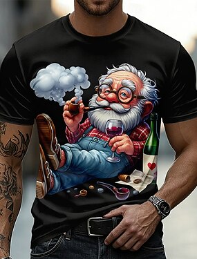 T-shirt humoristique à manches courtes et col rond représentant un vieil homme souriant fumant la pipe et buvant du vin (illustration 3D). Idée cadeau pour un grand-père amateur de vin, idéal pour un