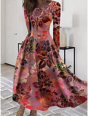Robe décontractée pour femme, robe florale, mode quotidienne, coupe classique, manches courtes, robe longue, robe maxi, col ras du cou, rose, rouge, bleu, gris, automne