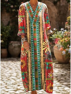 Robe mi-longue femme à col en V manches longues caftan léger coupe ample robe évasée décontractée boho sortie graphique géométrique abstrait manches longues col en V rouge bleu vert automne