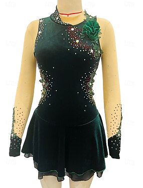 Robe de Patinage Artistique Femme Fille Patinage Robes Vert foncé Patchwork Dos ouvert Maille Haute élasticité Entraînement Compétition Tenue de Patinage Classique Cristal / Stras manche longue