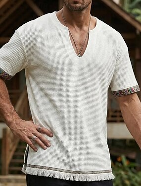 Homme Tee-shirt Gaufre T-shirt Manche Courte Col en V Été Printemps Couleur Unie Streetwear Élégant Occasionnel Frange à pompons Patchwork Occasionnel Quotidien Extérieur Blanche T-shirt haut de