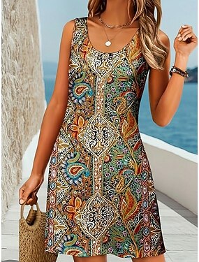 Femmes Mini Robe Robe d'Été Robe trapèze Robe d'été Vacances Occasionnel Plage Soirée Mariage Coupe régulière Fleuri Graphique Paisley Sans manches Col en U Marron clair Marron Bleu de minuit Ét