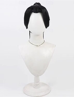 Perruque longue noire pour cosplay d'anime, chignon haut avec longue frange asymétrique sur le côté, cheveux synthétiques résistants à la chaleur