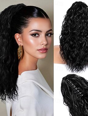 Extension queue de cheval à pince, 45 cm (18 pouces), cheveux bruns, noirs, ondulés et bouclés, effet naturel. Cette extension synthétique est idéale pour les femmes.
