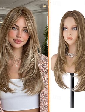 Perruques châtain clair pour femmes, perruques longues dégradées avec frange rideau, perruque synthétique aspect naturel pour un usage quotidien ou de soirée, 66 cm (26 pouces), blond mélangé châtain