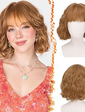 Perruque courte ondulée rousse dorée avec frange - Perruques courtes au carré roux doré pour femmes - Perruque au carré français texturée ondulée bouclée avec frange synthétique douce aspect naturel