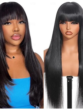Perruques lisses en cheveux humains avec frange, perruques brésiliennes vierges pour femmes, perruques sans colle, perruques en cheveux humains faites à la machine, perruques sans lace front, couleur