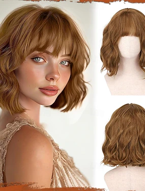 Perruque courte ondulée châtain doré - Coupe au carré de 30 cm avec frange pour femme, perruque bouclée mi-longue avec frange, perruque en cheveux synthétiques doux pour fille, usage quotidien et