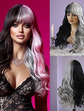 Perruque Synthétique Tissage bouclé Lisse naturel Coupe dégradée Avec frange Fabriqué à la Machine Perruque 26 pouces A1 Cheveux synthétiques Femmes Classique Confortable Dégradé de couleur Rose Noir