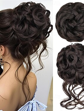 Lot de 2 chignons postiches ondulés et bouclés en fibres synthétiques, style chouchou, extension queue de cheval pour femme, brun foncé