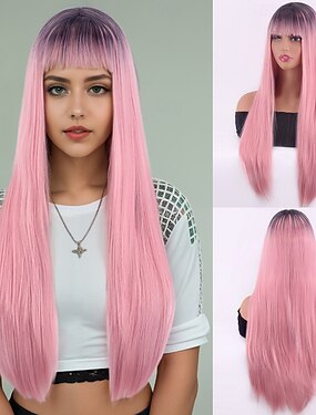 Perruque longue et lisse rose ombré avec frange, en cheveux synthétiques résistants à la chaleur, pour femme, look naturel, cosplay d'Halloween