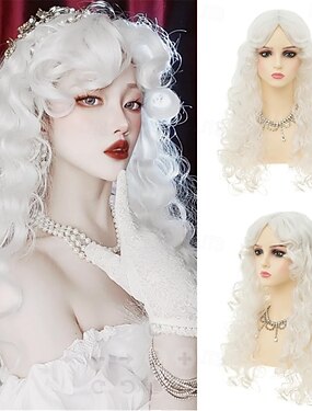 Perruque blanche longue et bouclée pour femme avec frange, style reine/princesse, raie au milieu, idéale pour le carnaval et les fêtes.
