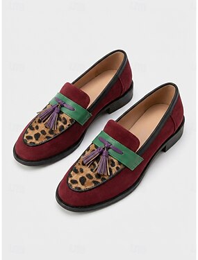 Mocassins à pampilles en daim bordeaux et vert pour femme, ornés d'un motif léopard – des chaussures plates confortables pour le travail et les sorties décontractées.