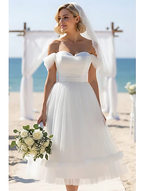 Robe de bal Ligne A Longueur thé Robe Blanche Robes de mariée Robes pour enterrement de vie de jeune fille robe de mariée Petites Robes Blanches Sans manches Coeur Mariage Remise des Diplômes Tulle