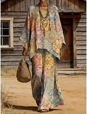 Femmes Chemise Ensembles en coton et lin Ensembles de Pantalons manche longue Manche cloche Col rond Graphique Paisley Imprimé Vacances Mode Streetwear Occasionnel Quotidien Extérieur Blanche bleu