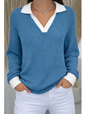 Femmes Tops tricotés côtelés T-shirt Faux deux pièces Couleurs contrastées Élégant Occasionnel manche longue Col en V Col de chemise Hauts Réguliers Quotidien Sortir Noir Rose poussiéreuse Bleu