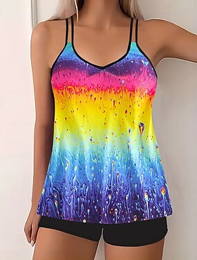 Maillot de bain tankini femme 2 pièces shorts dos nu vacances plage graphique ombre col en U sans manches