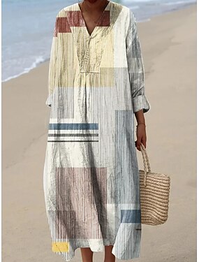 Femmes Robe maxi Robe d'Été Robe fourreau Vacances Occasionnel Plage Sortir Coupe Ample Graphique Géométrique Abstrait manche longue Col en V Bleu Marron Kaki Été Printemps
