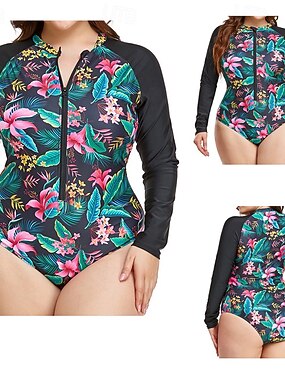 Femmes Maillot de bain Une pièce Maillot anti-UV grande taille Fleuri Tropical Zip Up Protection UV Élastique manche longue Maillot de Bain Surf Plage Vacances Été