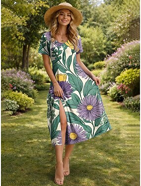 Femmes Robe Midi Robe T-Shirt Robe trapèze Robe d'été Vacances Occasionnel Plage Coupe régulière Fleuri Graphique Manche Courte Col en V Bleu Violet Vert Beige Été Printemps