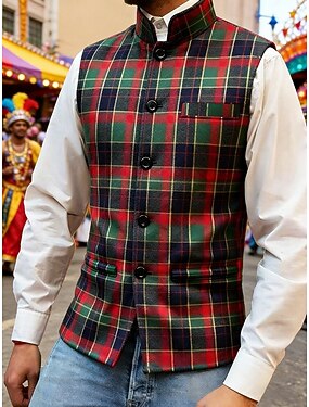 Homme Gilet Occasionnel Extérieur Carnaval Soirée Mode Streetwear Printemps Automne Boutons Polyester Respirabilité Plaid Simple Boutonnage Col montant Coupe régulière Vert Gilet