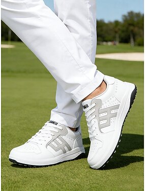 Chaussures de golf blanches pour hommes, tige résistante, semelle intermédiaire amortissante, adhérence antidérapante, idéales pour le golf, l'entraînement et les sports de plein air.