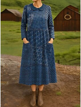 Femmes Robe Midi Robe fourreau Robe Plissée Vacances Occasionnel Boho Fête Robe de Printemps Coupe régulière Plaid Abstrait manche longue Col ras du cou Bleu Marron Sapin Marron Vert Printemps Automne
