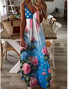 Jour de l'Indépendance Américaine Femmes Robe maxi Robe trapèze Robe Nuisette Vacances Occasionnel Sortir Coupe régulière Graphique Drapeau Américain Sans manches Col en V Bretelles spaghetti Bleu