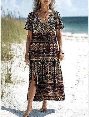 Femmes Robe Midi Robe T-Shirt Robe d'Été Robe fourreau Vacances Occasionnel Boho Plage Soirée Coupe régulière Graphique Ethnique Manche Courte Col en V Marron foncé Été Printemps