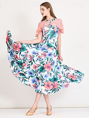 Danse de Salon Robe Impression Plis Épissage Femmes Soirée Entraînement Performance Manche Courte Spandex Polyester