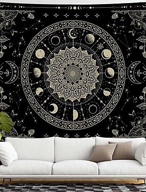Tapisserie murale mandala céleste en noir et blanc représentant les phases de la lune, ciel étoilé, art floral botanique, grand format, décoration murale, affiche en tissu