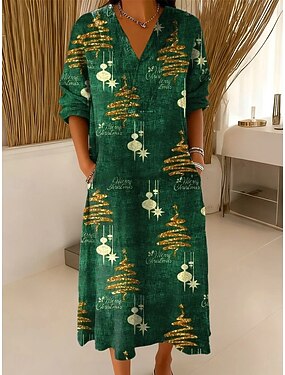 Noël Femmes Robe Midi Robe fourreau Vacances Occasionnel Sortir Coupe Ample Graphique Arbre de Noël manche longue Col en V Blanche Vin Rouge Vert Automne Hiver
