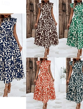 Femmes Robe Midi Robe Fleurie Robe Imprimée Mode Moderne Extérieur Vacances Sortir Coupe Ample Fleuri Sans manches Col montant Orange Marron Vert Bleu de minuit Été Printemps