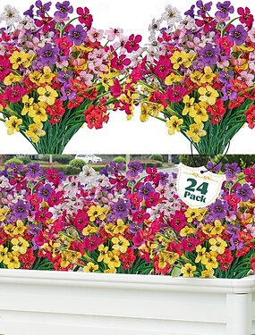 24 bouquets de fleurs artificielles d'extérieur, fleurs en plastique synthétique inaltérables, plantes artificielles décoratives pour jardinières suspendues, jardin, porche, jardinière de fenêtre,
