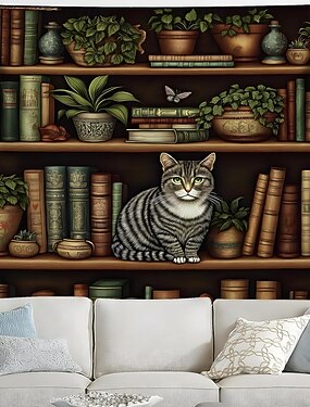 Tapisserie murale 3D représentant une étagère, un chat tigré réaliste, des livres anciens, des plantes en pot, idéale pour décorer une salle de travail, un espace de yoga ou de méditation.
