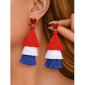 Boucles d'oreilles à pompons en polyester pour femmes, style varié, aux couleurs du drapeau américain (rouge, blanc et bleu), bijoux patriotiques, parfaits pour le 250e anniversaire des États-Unis, la fête de l'indépendance et au quotidien.