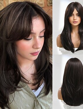 Perruque Synthétique Uniformes Costumes de carrière Princesse Droit Droit crépu Partie médiane Coupe Dégradée Avec Frange Fabriqué à la machine Perruque 22 pouces Brun foncé Cheveux Synthétiques Femme
